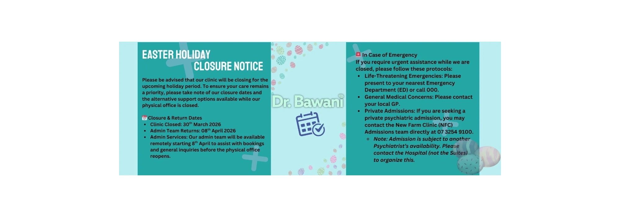Where to Find Us for Your In-Person Appointment: For all scheduled in-person appointments, please visit Ramsay Health Clinic at 22 Sargent Street, New Farm QLD.